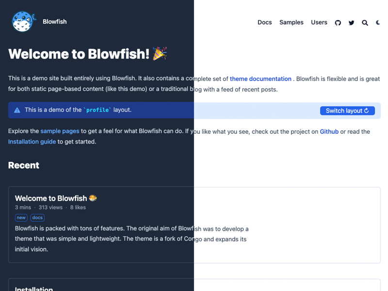 Blowfish also supports displaying the standard lists of articles as card galleries. You can config this both for the recent section in the homepage and for lists of articles across your website. For homepage you can use homepage.cardView and homepage.cardViewScreenWidth; and for lists use list.cardView and list.cardViewScreenWidth. Check the Configuration docs for more details, and the homepage for a live demo.